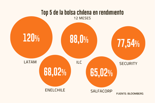 En detalle, Latam rindió en ese periodo un 120%, mientras que CMPC un 49%, Banco de Chile un 41%, Bci un 38% y Banco Santander un 36%.