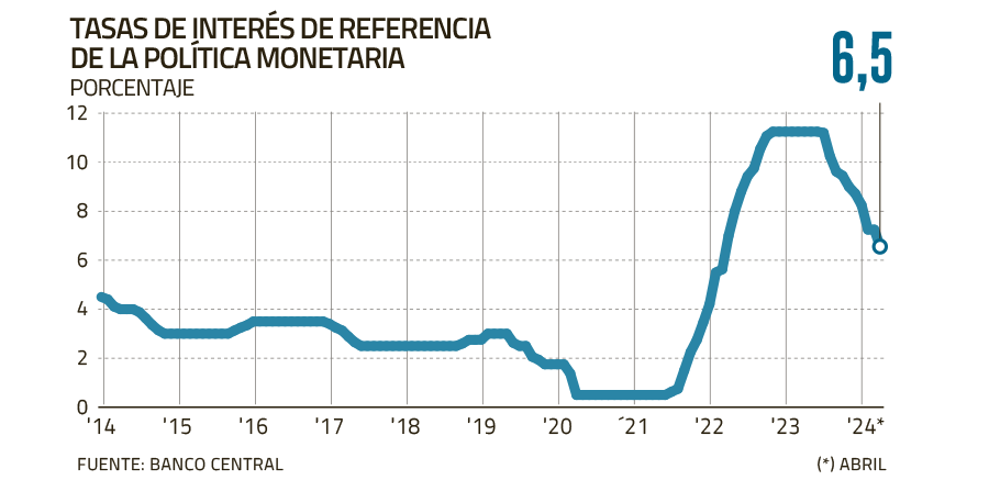 El Banco Central recortó en 75 puntos base la Tasa de Política Monetaria (TPM), ubicándola en 6,5%. El comunicado se enfocó en destacar el crecimiento sobre lo esperado de los últimos meses, una inflación que ha sido más persistente y que los futuros recortes en la TPM tomarán en cuenta la evolución de este contexto macroeconómico.